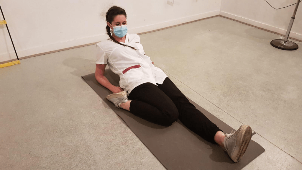 - Moyen fessier: allongé sur le côté, jambes alignées au tronc, décollez la jambe du dessus en gardant le pied bien parallèle au sol. Effectuez des petits cercle avec le pied (la hanche) en gardant la jambe tendue (10 dans un sens puis 10 dans l’autre)