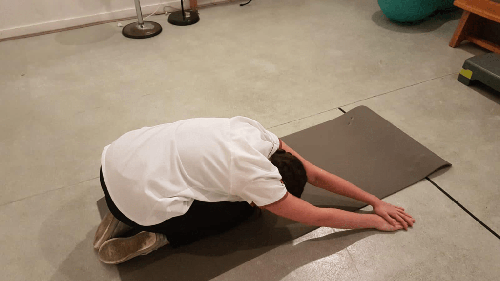- Flexion: En position à genoux assis sur les talons, enroulez la tête et le dos et venez chercher le plus loin possible en avant avec vos mains au sol jusqu’à ressentir l’étirement le long de la colonne vertébrale . Attention à ne pas décoller les fesses des talons.
