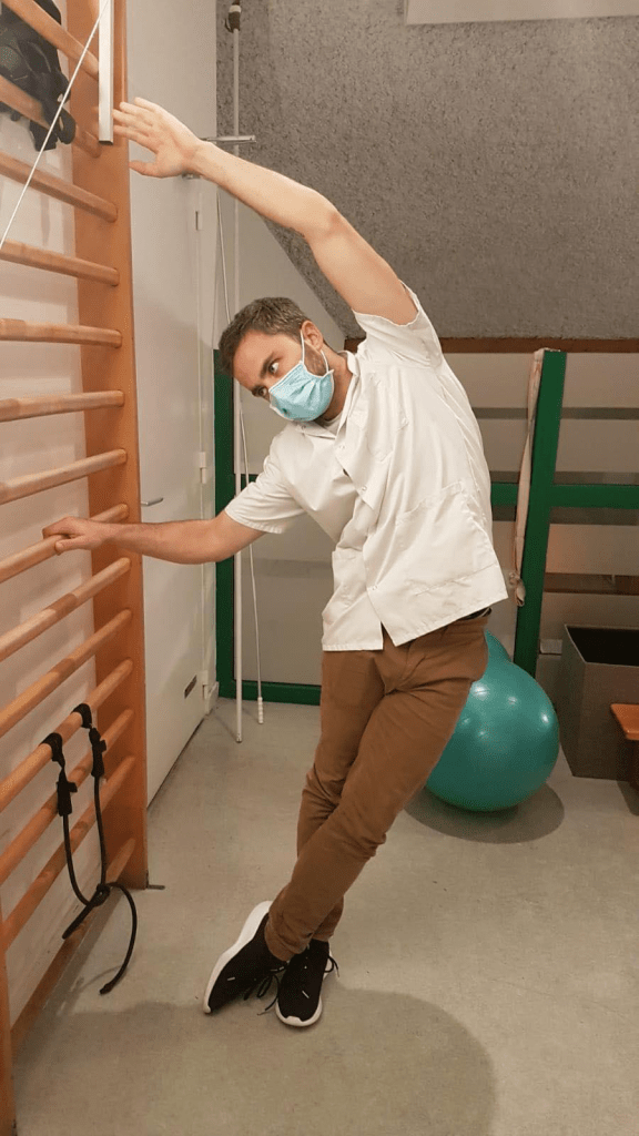 - Inclinaison: Debout, se tenir près d’un mur ou d’une barrière pour pouvoir s’équilibrer. Mettez une jambe pointe de pied vers l’intérieur, et mettez le bras du même côté au-dessus de la tête. Inclinez le buste en écartant le bassin du mur jusqu’à ressentir l’étirement sur le flanc. Attention à ne pas tourner le bassin, restez bien perpendiculaire au mur.