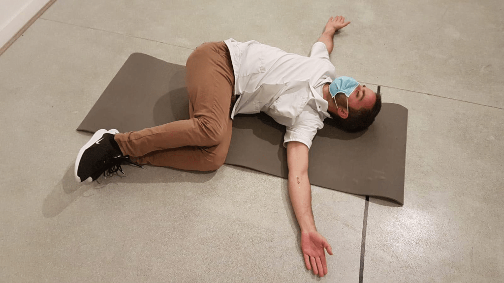 - Rotations: Allongé sur le côté, repliez les jambes à l’équerre (90° de flexion de hanche et de genou). Tendez les bras devant vous puis venez ouvrir avec le bras vers le côté opposé aux jambes (faire une rotation du buste, la tête suit le mouvement du bras), jusqu’à ressentir l’étirement face antérieure de l’épaule (pec) et sur le côté du tronc. Expirez pour vider la cage thoracique et majorer l’étirement.